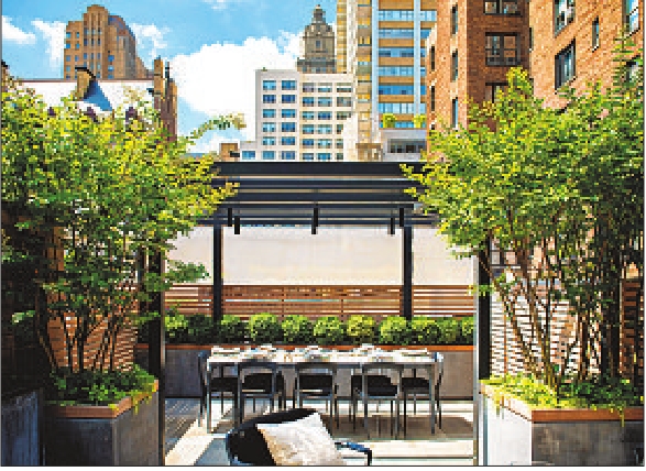 Askylight brightens the master suite, which extends to a chic bathroom with a free-standing tub. Outside, a landscaped terrace adds a covered dining area.