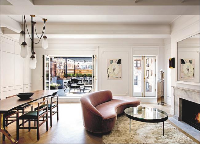 Set atop a 116-year-old Georgian-style mansion, the Upper West Side home was recently redesigned. The stylistic overhaul replicated original details such as period moldings and added new flair as well, including French casement windows and white oak herringbone floors.