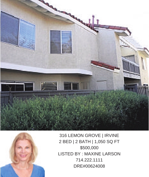 316 LEMON GROVE |IRVINE 2BED |2BATH |1,050 SQFT $500,000 LISTED BY :MAXINE LARSON 714.222.1111 DRE#00624008
