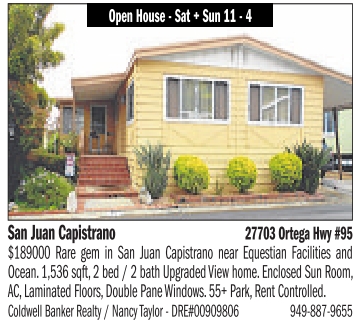 San Juan Capistrano 27703 Ortega Hwy#95 $189000 Rare gem in San Juan Capistrano near Equestian Facilities and Ocean. 1,536 sqft, 2bed /2bathUpgraded View home. Enclosed Sun Room, AC, Laminated Floors, Double Pane Windows. 55+ Park, Rent Controlled. Coldwell Banker Realty /Nancy Taylor -DRE#00909806 949-887-9655