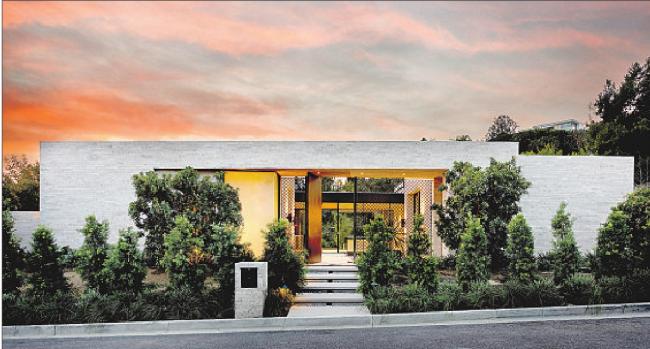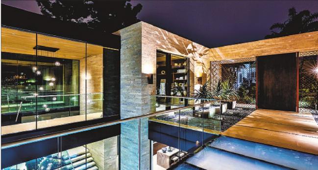 The contemporary-style home was designed by architect Paul McClean and has interiors by designer Lindsay Chambers. Reached by a floating catwalkstyle bridge, the glass-walled house was designed to shield the lower levels from view.
