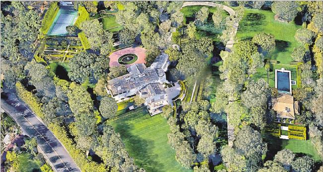 At the heart of the estate is a Georgian Revival-style mansion that was renovated by Geffen during his ownership. A golf course, a tennis court, a swimming pool, fern gardens, fountains and sculptures fill the grounds.
