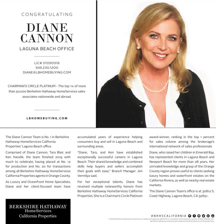 The Diane Cannon Team is No. 1 in Berkshire Hathaway HomeServices California Properties’ Laguna Beach office.