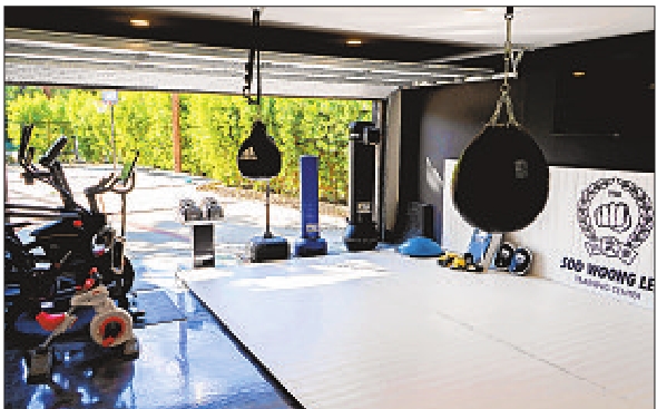 Now Lee wants to train Cash. The gym’s punching bags, shields and mats help the actor sharpen and maintain his skills. Meanwhile, Lee’s wife, actress Jennifer Birmingham Lee, uses the Peloton bike and elliptical machine, and Cash gets his own miniature stationary bike. The family dogs — labradoodle Kevin, Boston terrier Rusty and Shih Tzu Teddy, who otherwise roam free in the house — are not allowed, however.