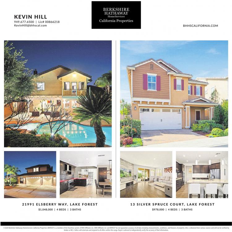 KEVIN HILL 949.677.6500 | Lic# 00866218 KevinHill@bhhscal.com BHHSCALIFORNIA.COM 21991 ELSBERRY WAY, LAKE FOREST $1,048,000 | 4 BEDS | 3 BATHS 13 SILVER SPRUCE COURT, LAKE FOREST $978,000 | 4 BEDS | 3 BATHS ©2020 BerkshireHathawayHomeServices California Properties (BHHSCP)isamember of the franchise system of BHH AffiliatesLLC.BHH AffiliatesLLC and BHHSCP do not guaranteeaccuracyofall data including measurements,conditions,and features of property.Info. is obtained from various sourcesand will not be verified by broker or MLS. Sellers will entertain and respond to all offers within this range. Buyer is advised to independently verify the accuracyofthatinformation.