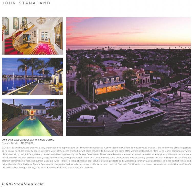 2104 East Balboa Boulevard presents a truly unprecedented opportunity to build your dream residence in one of Southern California’s most coveted locations. Situated on one of the largest lots on Peninsula Point, the property boasts sweeping views of the ocean and harbor,with close proximity to the wedge and some of the world’sbest beaches. Plans for an iconic, contemporary work of architecture by Hudgins Design Group have already been approved by the Coastal Commission. These plans describe a residence that optimizes both the large lot and bayfront location — a multi-leveled estate with a subterranean garage, home theatre, rooftop deck, and 73-foot boat dock. Home to some of the world’s most discerning purveyors of luxury, Newport Beach offers the greatest combination of modern Southern California living — blessed with picturesque beaches, breathtaking sunsets, and a welcoming community, all encompassed in the perfect climate and natural beauty of the California Riviera. Representing the best of both worlds, this property offers a coveted bayfront Peninsula Point location, yet is only minutes from coastal Orange County’s best world-class dining, shopping, and five-star resorts. Welcome to your personal paradise.