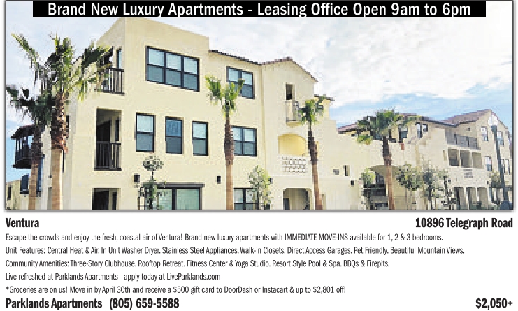*Groceries areonus! Move in by April30thand receivea$500 giftcardtoDoorDash or Instacart&upto$2,801 off! ParklandsApartments (805) 659-5588 $2,050+