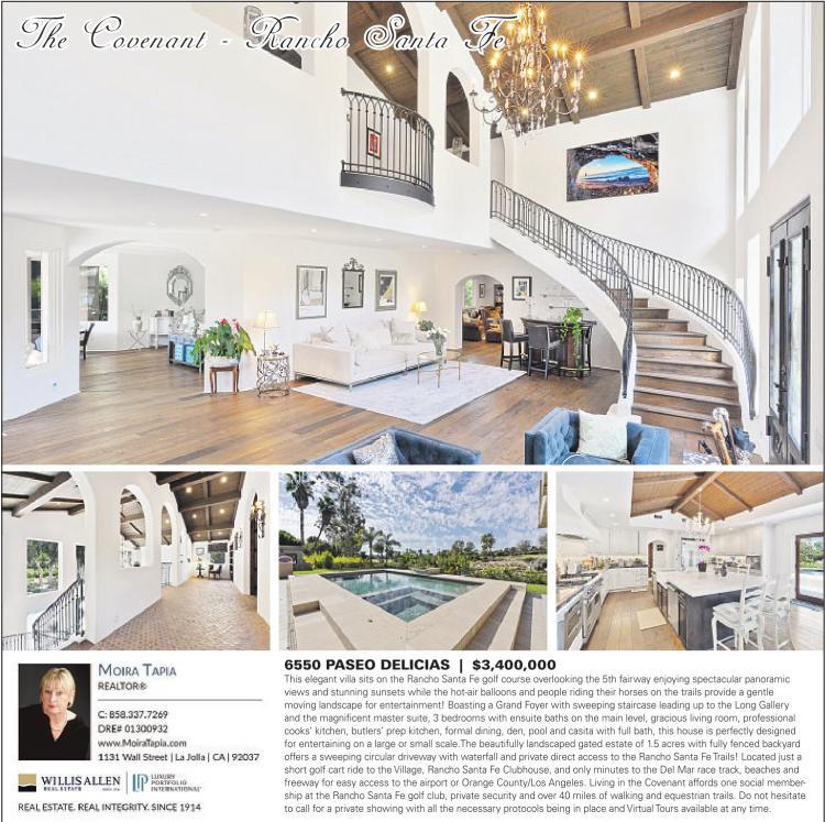 6550 PASEO DELICIAS | $3,400,000 This elegant villa sits on the Rancho Santa Fe golf course overlooking the 5th fairway enjoying spectacular panoramic views and stunning sunsets while the hot-air balloons and people riding their horses on the trails provide a gentle moving landscape for entertainment! Boasting a Grand Foyer with sweeping staircase leading up to the Long Gallery and the magnificent master suite, 3 bedrooms with ensuite baths on the main level, gracious living room, professional cooks’ kitchen, butlers’ prep kitchen, formal dining, den, pool and casita with full bath, this house is perfectly designed for entertaining on a large or small scale.The beautifully landscaped gated estate of 1.5 acres with fully fenced backyard offers a sweeping circular driveway with waterfall and private direct access to the Rancho Santa FeTrails! Located just a short golf cart ride to the Village, Rancho Santa Fe Clubhouse, and only minutes to the Del Mar race track, beaches and freeway for easy access to the airport or Orange County/Los Angeles. Living in the Covenant affords one social membership at the Rancho Santa Fe golf club, private security and over 40 miles of walking and equestrian trails. Do not hesitate to call for a private showing with all the necessary protocols being in place and Virtual Tours available at any time.