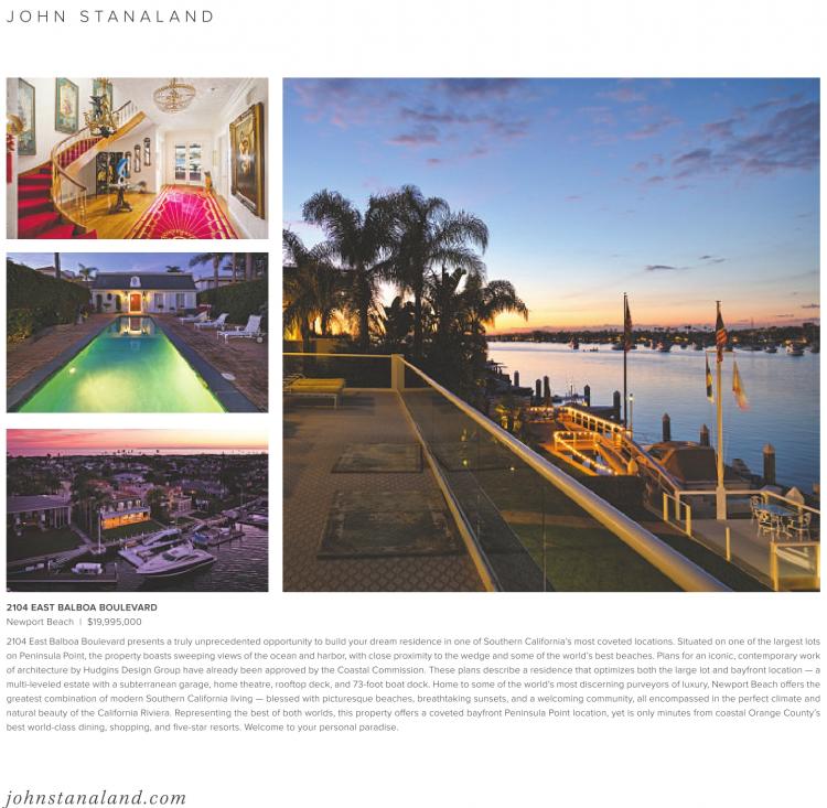 J O H N S T A N A L A N D 2104 EAST BALBOA BOULEVARD Newport Beach | $19,995,000 2104 East Balboa Boulevard presents a truly unprecedented opportunity to build your dream residence in one of Southern California’s most coveted locations. Situated on one of the largest lots on Peninsula Point, the property boasts sweeping views of the ocean and harbor,with close proximity to the wedge and some of the world’sbest beaches. Plans for an iconic, contemporary work of architecture by Hudgins Design Group have already been approved by the Coastal Commission. These plans describe a residence that optimizes both the large lot and bayfront location — a multi-leveled estate with a subterranean garage, home theatre, rooftop deck, and 73-foot boat dock. Home to some of the world’s most discerning purveyors of luxury, Newport Beach offers the greatest combination of modern Southern California living — blessed with picturesque beaches, breathtaking sunsets, and a welcoming community, all encompassed in the perfect climate and natural beauty of the California Riviera. Representing the best of both worlds, this property offers a coveted bayfront Peninsula Point location, yet is only minutes from coastal Orange County’s best world-class dining, shopping, and five-star resorts. Welcome to your personal paradise. johnstanaland.com