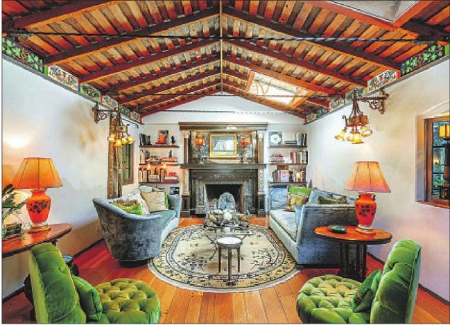 The main house, designed in country French style, is full of character. Vaulted and beamed ceilings, vintage tilework and hardwood floors are among details of note. An ornate fireplace anchors a far wall in the great room, while sets of French doors in the dining room open to a garden courtyard.
