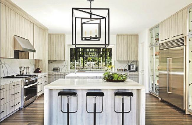 Acolumn-lined entrance opens to the home of more than 5,500 square feet. The single-story floor plan features high ceilings, gallery walls and skylights that bathe the minimalist-vibe interior in natural light. The gleaming chef’s kitchen is equipped with two islands. In the family room/den, there’s a wet bar. A total of four bedrooms and six bathrooms includes an expansive master suite with dual bathrooms and walk-in closets.