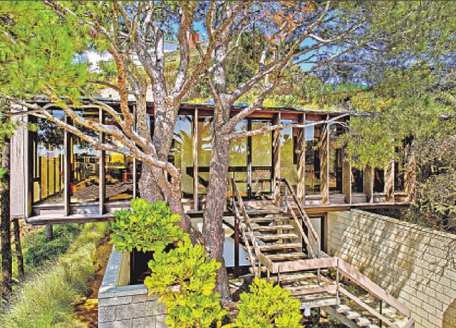 Niles is known for his chic glass structures, and this one is no different. A floating staircase with afountain leads up to the threebedroom house, which has walls of glass, cut with beams, across roughly 2,300 square feet.