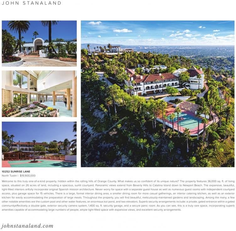 JOHN STANALAND 10252 SUNRISE LANE North Tustin | $19,900,000 Welcome to this truly one-of-a-kind property, hidden within the rolling hills of Orange County. What makes us so confident of its unique nature? The property features 36,000 sq. ft. of living space, situated on 26 acres of land, including a spacious, sunlit courtyard. Panoramic views extend from Beverly Hills to Catalina Island down to Newport Beach. The expansive, beautiful, light-filled interiors artfully incorporate original Spanish mission architecture. Never worry for space with a separate guest house as well as numerous guest rooms with independent courtyard access, plus garage space for 15 vehicles. There is a large, formal interior dining area, a smaller dining room for more casual gatherings, an interior catering kitchen, as well as an exterior kitchen for easily accommodating the preparation of large meals. Throughout the property, you will find beautiful, meticulously-maintained gardens and landscaping. Among the many, a few other notable amenities are the custom pool and other water features, an enormous koi pond, and two elevators. Superb security arrangements include: a private, gated entrance within a gated communityeffectively a double gate, exterior security camera system, 1,400 sq. ft. security garage, and a secure panic room. As you can see, this is a truly rare space, incorporating superb amenities capable of accommodating large numbers of people, ample light-filled space with expansive views, and excellent security arrangements. johnstanaland .com