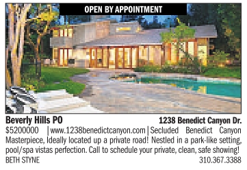 OPEN BY APPOINTMENT Beverly Hills PO 1238Benedict Canyon Dr. $5200000 |www.1238benedictcanyon.com|Secluded Benedict Canyon Masterpiece, Ideally located up aprivate road! Nestled in apark-like setting, pool/spa vistas perfection. Call to schedule your private, clean, safe showing! BETHSTYNE 310.367.3388