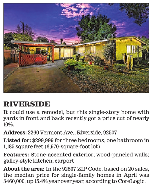RIVERSIDE It could use a remodel, but this single-story home with yards in front and back recently got a price cut of nearly 10%. Address: 2260 Vermont Ave., Riverside, 92507 Listed for: $299,999 for three bedrooms, one bathroom in 1,185 square feet (6,970-square-foot lot) Features: Stone-accented exterior; wood-paneled walls; galley-style kitchen; carport About the area: In the 92507 ZIP Code, based on 20 sales, the median price for single-family homes in April was $460,000, up 15.4% year over year, according to CoreLogic. See also
