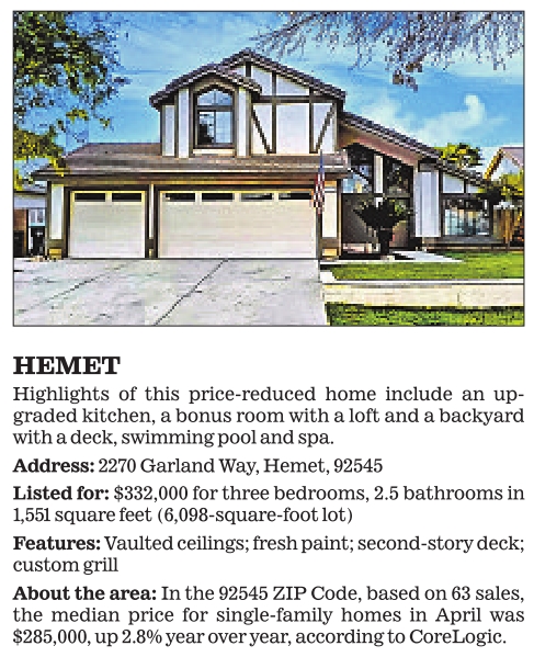 About the area: In the 92545 ZIP Code, based on 63 sales, the median price for single-family homes in April was $285,000, up 2.8% year over year, according to CoreLogic.