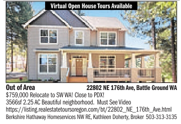 Out of Area 22802NE176th Ave, Battle Ground WA $759,000 Relocate to SW WA! Close to PDX! 3566sf 2.25 AC Beautiful neighborhood. Must See Video https://listing.realestatetoursoregon.com/bt/22802_NE_176th_Ave.html BerkshireHathaway Homeservices NW RE,Kathleen Doherty,Broker 503-313-3135