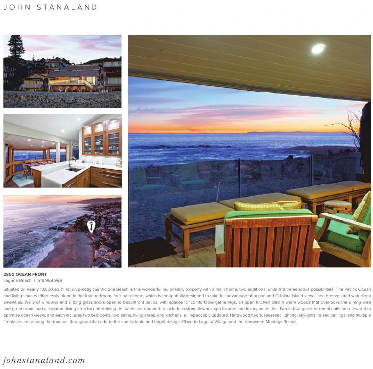 Situated on nearly 10,000 sq. ft. lot on prestigious Victoria Beach is this wonderful multi-family property with a main home, two additional units and tremendous possibilities. The Pacific Ocean and living spaces effortlessly blend in the four-bedroom, four-bath home, which is thoughtfully designed to take full advantage of ocean and Catalina Island views, sea breezes and waterfront amenities. Walls of windows and sliding glass doors open to beachfront patios, with spaces for comfortable gatherings, an open kitchen clad in warm woods that overlooks the dining area and great room, and a separate living area for entertaining. All baths are updated to include custom tilework, spa fixtures and luxury amenities. Two in-law, guest or rental units are elevated to optimize ocean views, and each includes two bedrooms, two baths, living areas, and kitchens, all impeccably updated. Hardwood floors, recessed lighting, skylights, raised ceilings, and multiple fireplaces are among the touches throughout that add to the comfortable and bright design. Close to Laguna Village and the renowned Montage Resort.