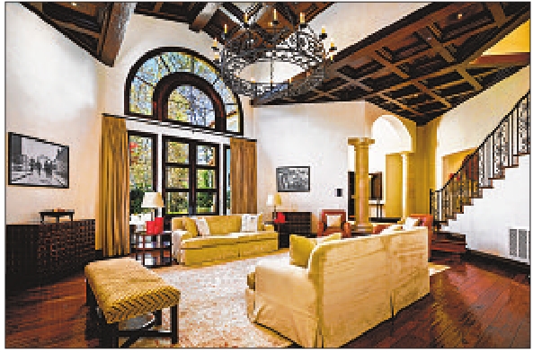 The Spanish-style main house, though built in 1991, is full of Old World details. Of note are five fireplaces with carved limestone mantels, hand-hewn walnut flooring, beamed ceilings and custom chandeliers. A wood-paneled library draws the eyes upward with two levels of built-ins. Rows of recliners fill the theater room.