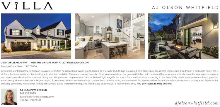 A J O L S O N W H I T F I E L D 2078 TABLELANDS WAY | VISIT THE VIRTUAL TOUR AT 2078TABLELANDS.COM Eastside Costa Mesa | $1,375,000 A stunning contemporary farmhouse in a picture-perfect neighborhood awaits you! Located on a private Cul-de-Sac in coveted East Side Costa Mesa, this immaculate 3 bedroom, 3 bathroom home has it all from the impeccable architectural style to attention to detail. The open concept floorplan flows seamlessly from the gourmet kitchen with hardwood floors, premium stainless appliances, quartz counters, and expansive island to the spacious dining and living rooms complete with built-ins. Natural light engulfs the space from multiple sliders opening to the beautifully hardscaped patio and firepit great for entertaining. Upstairs features a large skylight, 3 bedrooms all with vaulted ceilings, custom fans, laundry room, and a coveted flex space perfect for a home office, family room or play area. Enjoy all this amazing community has to offer from great schools, parks, incredible dining, and world-class beaches just a few minutes away. You don’t want to miss this one! AJ OLSON WHITFIELD 949 433 8989 awhitfield@villarealestate.com DRE No. 01869034 ajolsonwhitfield.com