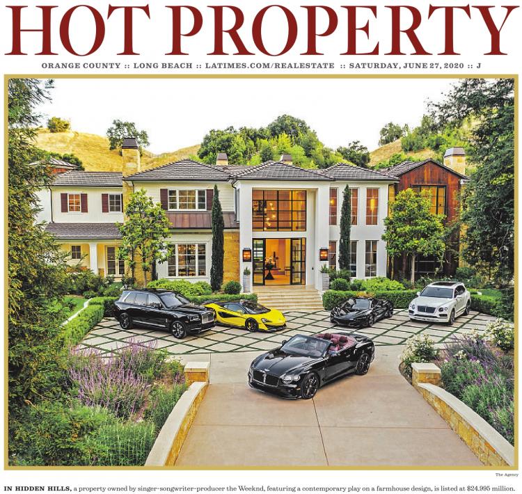 IN HIDDEN HILLS, a property owned by singer-songwriter-producer the Weeknd, featuring a contemporary play on a farmhouse design, is listed at $24.995 million.