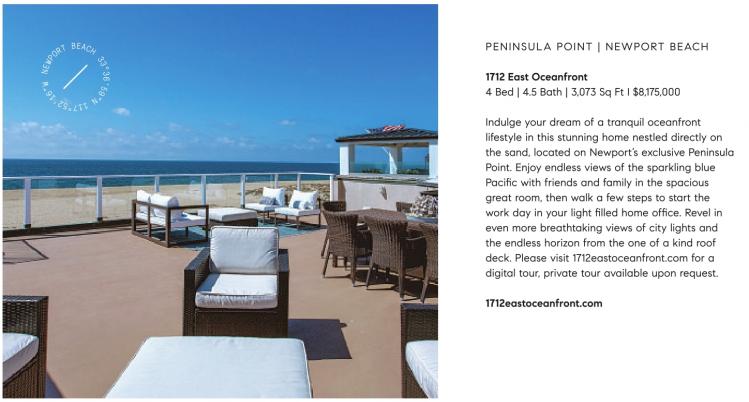 Indulge your dream of a tranquil oceanfront lifestyle in this stunning home nestled directly on the sand, located on Newport’s exclusive Peninsula Point. Enjoy endless views of the sparkling blue Pacific with friends and family in the spacious great room, then walk a few steps to start the work day in your light filled home office. Revel in even more breathtaking views of city lights and the endless horizon from the one of a kind roof deck. Please visit 1712eastoceanfront.com for a digital tour, private tour available upon request.