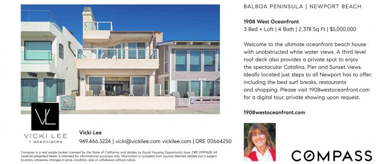 Vicki Lee 949.466.3224 | vicki@vickilee.com vickilee.com | DRE 00664250 Compass is areal estate broker licensed bythe State ofCalifornia and abides byEqual Housing Opportunity laws. DRE 01991628. All material presented herein is intended for informational purposes only. Information is compiled from sources deemed reliable but issubject to errors, omissions, changes inprice, condition, sale or withdrawal without notice. BALBOA PENINSULA | NEWPORT BEACH 1908 West Oceanfront 3 Bed + Loft | 4 Bath | 2,378 Sq Ft | $5,000,000 Welcome to the ultimate oceanfront beach house with unobstructed white water views. A third level roof deck also provides a private spot to enjoy the spectacular Catalina, Pier and Sunset views. Ideally located just steps to all Newport has to offer, including the best surf breaks, restaurants and shopping. Please visit 1908westoceanfront.com for a digital tour, private showing upon request. 1908westoceanfront.com