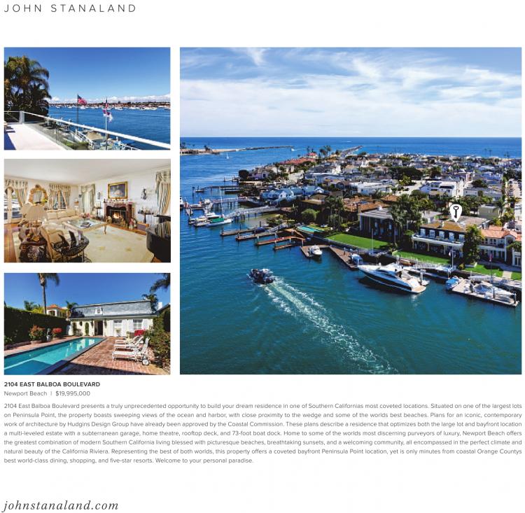 J O H N S T A N A L A N D 2104 EAST BALBOA BOULEVARD Newport Beach | $19,995,000 2104 East Balboa Boulevard presents a truly unprecedented opportunity to build your dream residence in one of Southern Californias most coveted locations. Situated on one of the largest lots on Peninsula Point, the property boasts sweeping views of the ocean and harbor, with close proximity to the wedge and some of the worlds best beaches. Plans for an iconic, contemporary work of architecture by Hudgins Design Group have already been approved by the Coastal Commission. These plans describe a residence that optimizes both the large lot and bayfront location a multi-leveled estate with a subterranean garage, home theatre, rooftop deck, and 73-foot boat dock. Home to some of the worlds most discerning purveyors of luxury, Newport Beach offers the greatest combination of modern Southern California living blessed with picturesque beaches, breathtaking sunsets, and a welcoming community, all encompassed in the perfect climate and natural beauty of the California Riviera. Representing the best of both worlds, this property offers a coveted bayfront Peninsula Point location, yet is only minutes from coastal Orange Countys best world-class dining, shopping, and five-star resorts. Welcome to your personal paradise. johnstanaland .com