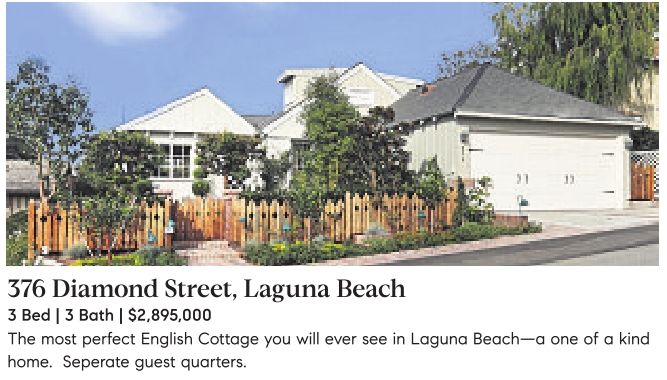 3 Bed | 3 Bath | $2,895,000 The most perfect English Cottage you will ever see in Laguna Beach—a one of a kind home. Seperate guest quarters.