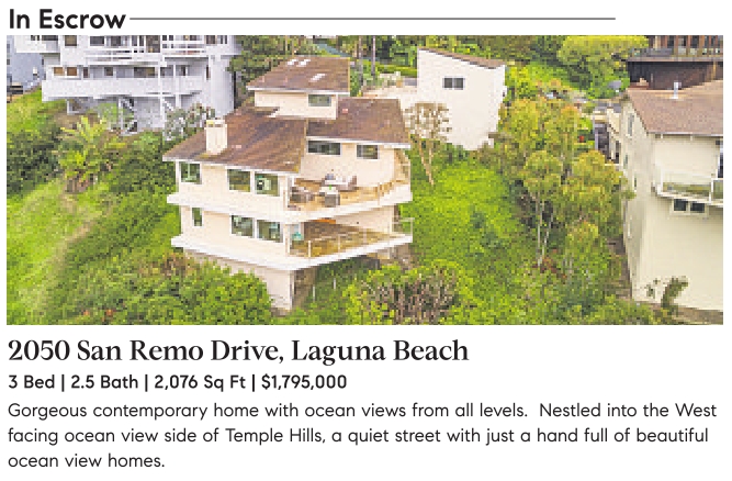 In Escrow 2050 San Remo Drive, Laguna Beach 3 Bed | 2.5 Bath | 2,076 Sq Ft | $1,795,000 Gorgeous contemporary home with ocean views from all levels. Nestled into the West facing ocean view side of Temple Hills, a quiet street with just a hand full of beautiful ocean view homes. See also