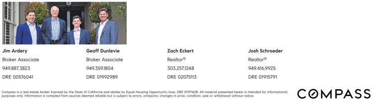 Compass is areal estate broker licensed bythe State ofCalifornia and abides byEqual Housing Opportunity laws. DRE 01991628. All material presented herein is intended for informational purposes only. Information is compiled from sources deemed reliable but is subject to errors, omissions, changes in price, condition, sale or withdrawal without notice.