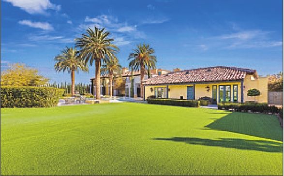 The 13,500-square-foot mansion sits on 1.4 acres in a doublegated community a few miles west of the Strip. Dramatic columns and a fountain frame the approach to the home. Inside, the living spaces have been remodeled with high-tech upgrades and custom finishes such as copper ceilings, gilded doors, silk carpeting and fabric walls.