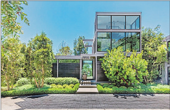 Completed this year, the home draws the eye with a bold exterior of sleek gray tones and stone accents. Inside, wood finishes touch up open living spaces with white walls, white ceilings and floor-toceiling windows.