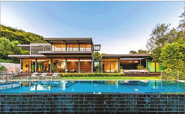 Glass encloses an office and wine cellar; other highlights include a custom kitchen, yoga studio, movie theater and indooroutdoor lounge with wet bar.