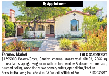 By Appointment Farmers Market 170 SGARDNER ST $1795000 Beverly/Grove, Spanish charmer awaits you! 4B/3B, 2366 sq ft, lush landscaping,living room with picture window &decorative fireplace, beamed ceiling,wood floors, two primary suites, open dining/kitchen. BerkshireHathaway HomeServicesCAProperties/Richard Burt 8182039797