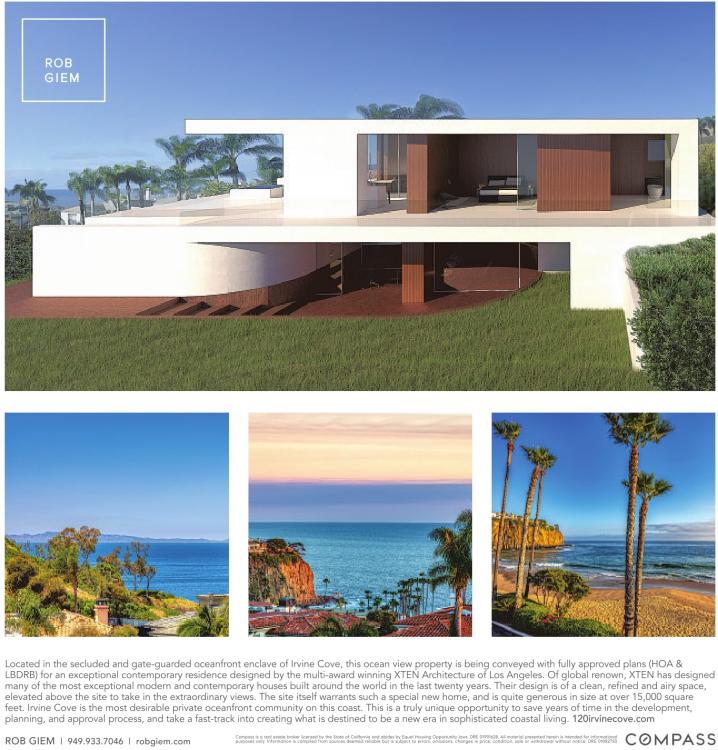 Located in the secluded and gate-guarded oceanfront enclave of Irvine Cove, this ocean view property is being conveyed with fully approved plans (HOA & LBDRB) for an exceptional contemporary residence designed by the multi-award winning XTEN Architecture of Los Angeles. Of global renown, XTEN has designed many of the most exceptional modern and contemporary houses built around the world in the last twenty years. Their design is of a clean, refined and airy space, elevated above the site to take in the extraordinary views. The site itself warrants such a special new home, and is quite generous in size at over 15,000 square feet. Irvine Cove is the most desirable private oceanfront community on this coast. This is a truly unique opportunity to save years of time in the development, planning, and approval process, and take a fast-track into creating what is destined to be a new era in sophisticated coastal living. 120irvinecove.com ROB GIEM | 949.933.7046 | robgiem.com Compass is areal estate broker licensed bythe State ofCalifornia and abides by Equal Housing Opportunity laws. DRE 01991628. All material presented herein is intended for informational purposes only. Information is compiled from sources deemed reliable but is subject toerrors, omissions, changes inprice, condition, sale or withdrawal without notice. DRE 01082750 See also