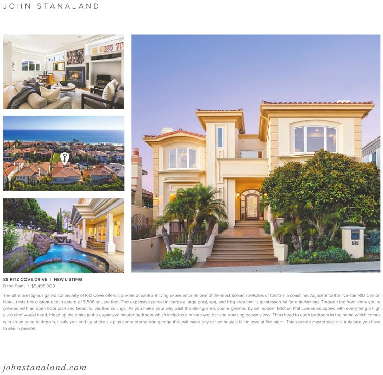 J O H N S T A N A L A N D 88 RITZ COVE DRIVE | NEW LISTING Dana Point | $5,495,000 The ultra prestigious gated community of Ritz Cove offers a private oceanfront living experience on one of the most scenic stretches of California coastline. Adjacent to the five-star Ritz Carlton Hotel, rests this custom ocean estate of 5,506 square feet. The expansive parcel includes a large pool, spa, and bbq area that is quintessential for entertaining. Through the front entry you’re greeted with an open floor plan and beautiful vaulted ceilings. As you make your way past the dining area, you’re greeted by an modern kitchen that comes equipped with everything a high class chef would need. Head up the stairs to the expansive master bedroom which includes a private wet bar and amazing ocean views. Then head to each bedroom in the home which comes with an en suite bathroom. Lastly you end up at the six plus car subterranean garage that will make any car enthusiast fall in love at first sight. This seaside master piece is truly one you have to see in person. johnstanaland .com