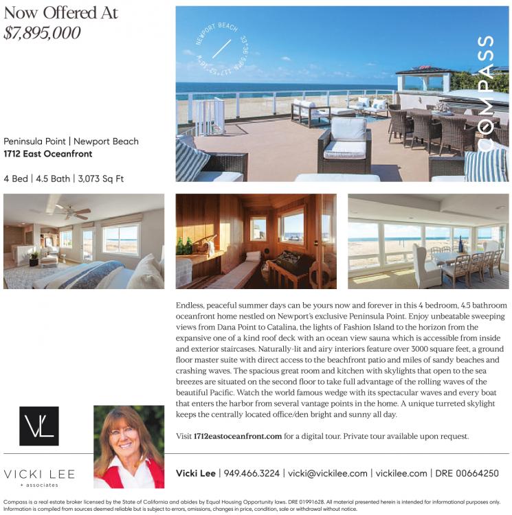 Now Offered At $7,895,000 Peninsula Point | Newport Beach 1712 East Oceanfront 4 Bed | 4.5 Bath | 3,073 Sq Ft Endless, peaceful summer days can be yours now and forever in this 4 bedroom, 4.5 bathroom oceanfront home nestled on Newport’s exclusive Peninsula Point. Enjoy unbeatable sweeping views from Dana Point to Catalina, the lights of Fashion Island to the horizon from the expansive one of a kind roof deck with an ocean view sauna which is accessible from inside and exterior staircases. Naturally-lit and airy interiors feature over 3000 square feet, a ground floor master suite with direct access to the beachfront patio and miles of sandy beaches and crashing waves. The spacious great room and kitchen with skylights that open to the sea breezes are situated on the second floor to take full advantage of the rolling waves of the beautiful Pacific. Watch the world famous wedge with its spectacular waves and every boat that enters the harbor from several vantage points in the home. A unique turreted skylight keeps the centrally located office/den bright and sunny all day. Visit 1712eastoceanfront.com for a digital tour. Private tour available upon request. Vicki Lee | 949.466.3224 | vicki@vickilee.com | vickilee.com | DRE 00664250 Compass is areal estate broker licensed by the State of California and abides by Equal Housing Opportunity laws. DRE 01991628. All material presentedhereinisintended forinformational purposes only. Information is compiled from sources deemed reliable but is subject to errors,omissions, changes in price, condition, sale or withdrawal without notice.