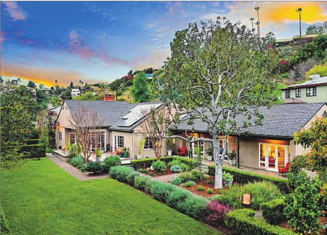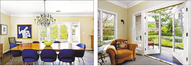 Features: Vaulted ceilings; hardwood and stone floors; woodpaneled library/den; updated kitchen; formal gardens; multiple patios