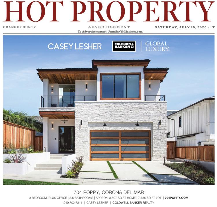 SATURDAY, JULY 25, 2020 :: T To Advertise contact: Jennifer.Yi@latimes.com 704 POPPY, CORONA DEL MAR 3 BEDROOM, PLUS OFFICE | 3.5 BATHROOMS | APPROX. 3,507 SQ FT HOME | 7,785 SQ FT LOT | 704POPPY.COM 949.702.7211 | CASEY LESHER | COLDWELL BANKER REALTY