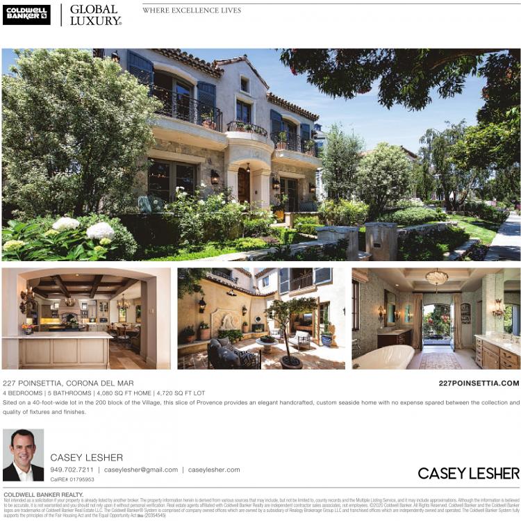 WHERE EXCELLENCE LIVES 227 POINSETTIA, CORONA DEL MAR 227POINSETTIA.COM 4 BEDROOMS | 5 BATHROOMS | 4,080 SQ FT HOME | 4,720 SQ FT LOT Sited on a 40-foot-wide lot in the 200 block of the Village, this slice of Provence provides an elegant handcrafted, custom seaside home with no expense spared between the collection and quality of fixtures and finishes. CASEY LESHER 949.702.7211 | caseylesher@gmail.com | caseylesher.com CalRE# 01795953 COLDWELL BANKER REALTY. Notintended as asolicitation if your property is already listed by another broker.The property information herein is derived from various sources that may include, but not be limited to, county records and the Multiple Listing Service, and it may include approximations.Although the information is believed to be accurate, it is not warranted and you should not rely upon it without personal verification. Real estate agents affiliated with Coldwell Banker Realty are independent contractor sales associates, not employees. ©2020 Coldwell Banker.All Rights Reserved. Coldwell Banker and the Coldwell Banker logos are trademarks of Coldwell Banker Real Estate LLC. The Coldwell Banker® System is comprised of company owned offices which are owned by asubsidiaryofRealogy Brokerage Group LLC and franchised offices which are independently owned and operated. The Coldwell Banker System fully supports the principles of the Fair Housing Act and the Equal Opportunity Act (20354545) See also