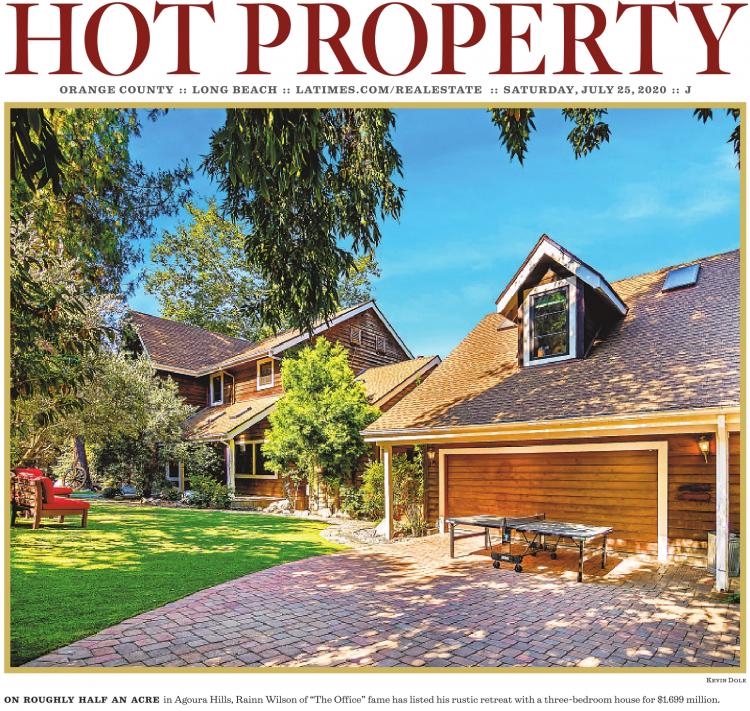 ON ROUGHLY HALF AN ACRE in Agoura Hills, Rainn Wilson of “The Office” fame has listed his rustic retreat with a three-bedroom house for $1.699 million.