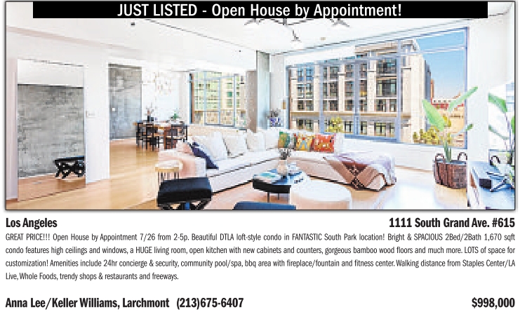 GREAT PRICE!!! Open House by Appointment 7/26 from 2-5p. Beautiful DTLA loft-style condo in FANTASTIC South Park location! Bright &SPACIOUS 2Bed/2Bath 1,670 sqft condo featureshighceilings and windows, aHUGE living room,open kitchenwith newcabinets andcounters,gorgeous bamboo wood floors andmuchmore. LOTS of space for customization! Amenities include 24hr concierge &security, community pool/spa, bbqarea with fireplace/fountain and fitness center.Walking distancefrom Staples Center/LA Live,Whole Foods, trendy shops &restaurants and freeways.