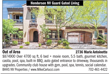 Out of Area 2736 Marie Antoinette $874900 Over 4700 sq ft, 6bed +movie room,5.5 bath, gourmet kitchen, casita, pool, spa, built-in BBQ, auto gated entrance to driveway,thousands in upgrades. Community club house with gym, pool, spa, tennis, social calendar. BHHS NV Properties /www.MikeCarlucci.com 702-461-4422