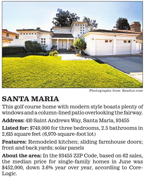 Photographs from Realtor.com SANTA MARIA This golf course home with modern style boasts plenty of windows and a column-lined patio overlooking the fairway. Address: 410 Saint Andrews Way, Santa Maria, 93455 Listed for: $749,000 for three bedrooms, 2.5 bathrooms in 2,615 square feet (6,970-square-foot lot) Features: Remodeled kitchen; sliding farmhouse doors; front and back yards; solar panels About the area: In the 93455 ZIP Code, based on 62 sales, the median price for single-family homes in June was $452,000, down 3.6% year over year, according to Core- Logic.