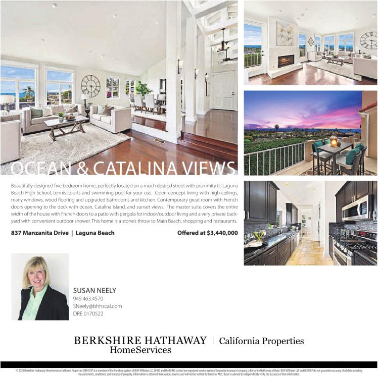 OCEAN & CATALINA VIEWS Beautifully designed fivebedroom home,perfectly located on amuch desired street with proximitytoLaguna Beach High School, tennis courts and swimming pool for your use. Open concept living with high ceilings, many windows, wood flooring and upgraded bathrooms and kitchen. Contemporary great room with French doors opening to the deck with ocean, Catalina Island, and sunset views. The master suite covers the entire width of the house with French doors to apatio with pergola forindoor/outdoor living and averyprivatebackyard with convenient outdoor shower. This home is a stone’s throw to Main Beach, shopping and restaurants. 837 Manzanita Drive | Laguna Beach Offered at $3,440,000 SUSAN NEELY 949.463.4570 SNeely@bhhscal.com DRE 0170522 ©2020BerkshireHathawayHomeServices California Properties (BHHSCP)isamember of the franchise system of BHH AffiliatesLLC.BHHS and the BHHS symbol areregistered servicemarks of Columbia InsuranceCompany, aBerkshireHathaway affiliate.BHH AffiliatesLLC and BHHSCP do not guaranteeaccuracyofall dataincluding measurements,conditions,and features of property.Information is obtained from varioussources and will not be verified by broker or MLS. Buyer is advised to independently verify the accuracyofthatinformation.