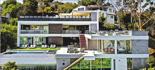 High Set at the end of a cul-de-sac, this modern mansion, above, takes full advantage of the scenic setting with three decks that total over 5,000 square feet of outdoor living space. Inside are bright indoor-outdoor areas with clean lines, as well as a movie theater, wine cellar, gym and “floating glass box” master suite that overlooks the infinity pool below.