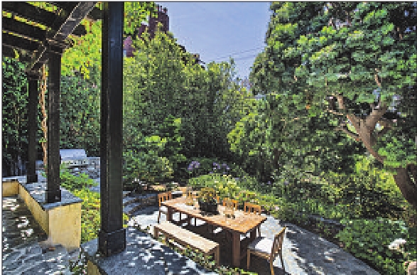 French doors open to a trellistopped patio and outdoor barbecue. Tiered garden planters, lawn and mature trees fill out the nearly half-acre of grounds.
