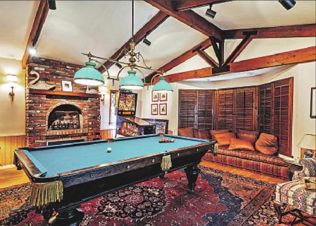 The 3,735-square-foot floor plan features high ceilings with exposed beams, handcrafted wrought-iron fixtures and a paneled library/den. There are four bedrooms, four bathrooms and an eat-in kitchen. The lower level holds a game room.