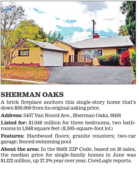 SHERMAN OAKS A brick fireplace anchors this single-story home that’s down $50,000 from its original asking price. Address: 5457 Van Noord Ave., Sherman Oaks, 91401 Listed for: $1.049 million for three bedrooms, two bathrooms in 1,848 square feet (8,505-square-foot lot) Features: Hardwood floors; granite counters; two-car garage; fenced swimming pool About the area: In the 91401 ZIP Code, based on 10 sales, the median price for single-family homes in June was $1.122 million, up 37.3% year over year, CoreLogic reports. See also